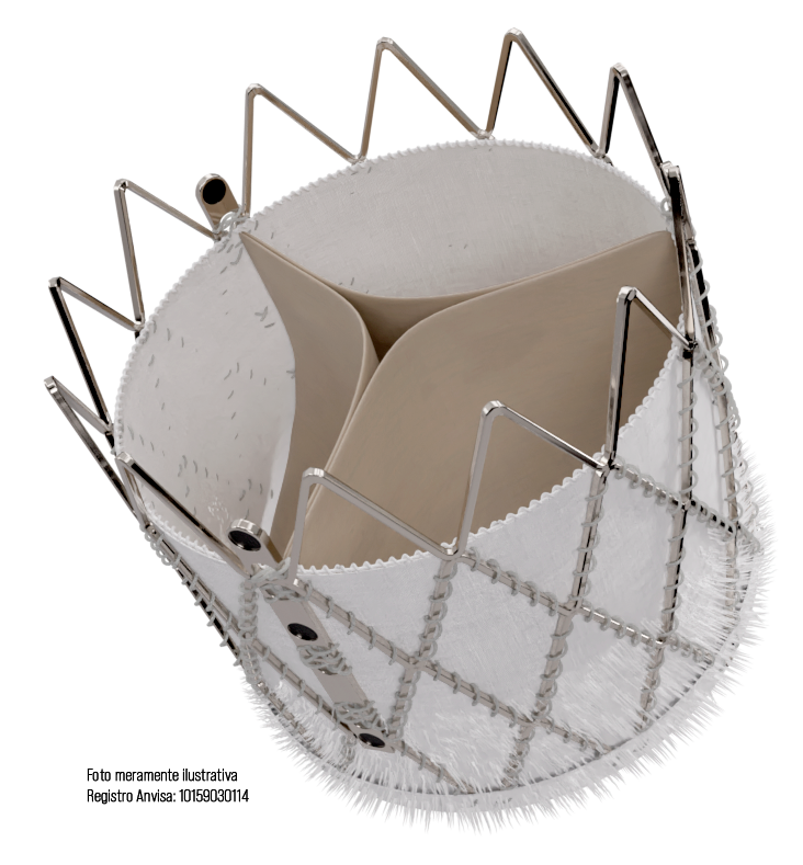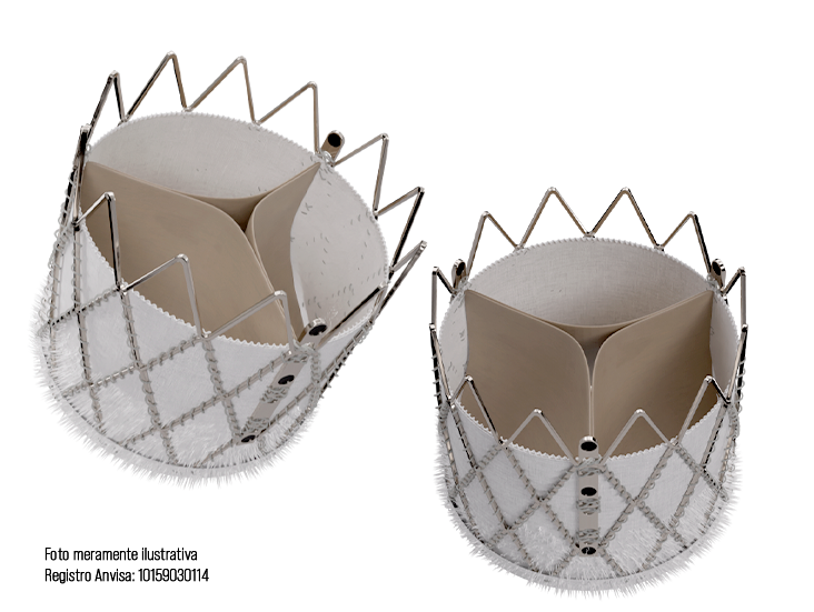 Material: Revestimento interno e saia externa de poliéster, pericárdio bovino com tratamento anticalcificante, estrutura metálica de cromo cobalto, marcadores radiopacos de tântalo para posicionamento e alinhamento das comissuras.